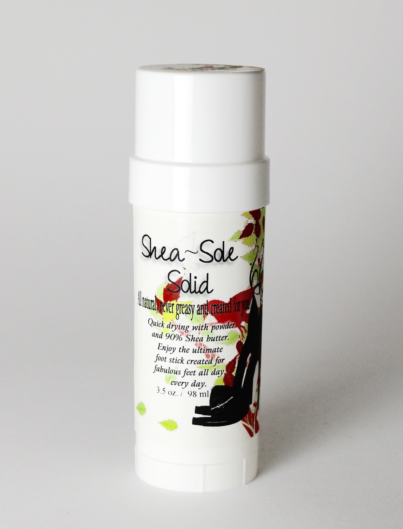 Our Shea-Sole Solid Foot Stick is 100% natural and 90% Shea Butter with Vegetable powder for wicking away unwanted moisture.